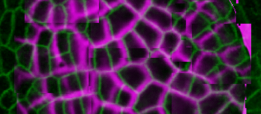 Unaligned overlay of cell wall stiffness (magenta) and plasma membrane marker (green) in the Arabidopsis shoot apical meristem, acquired by the AFM-CLSM imaging platform. Image by Nathanael Tan (2022).