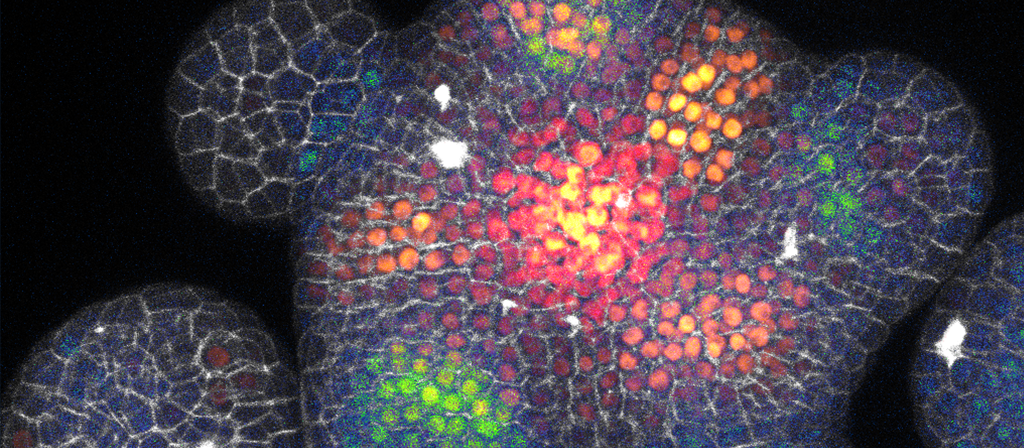 Image of a live Arabidopsis shoot apical meristem with five fluorescent markers of different tissue types and cell components. Biomaterial generated by Galvan-Ampudia et al. (2020).